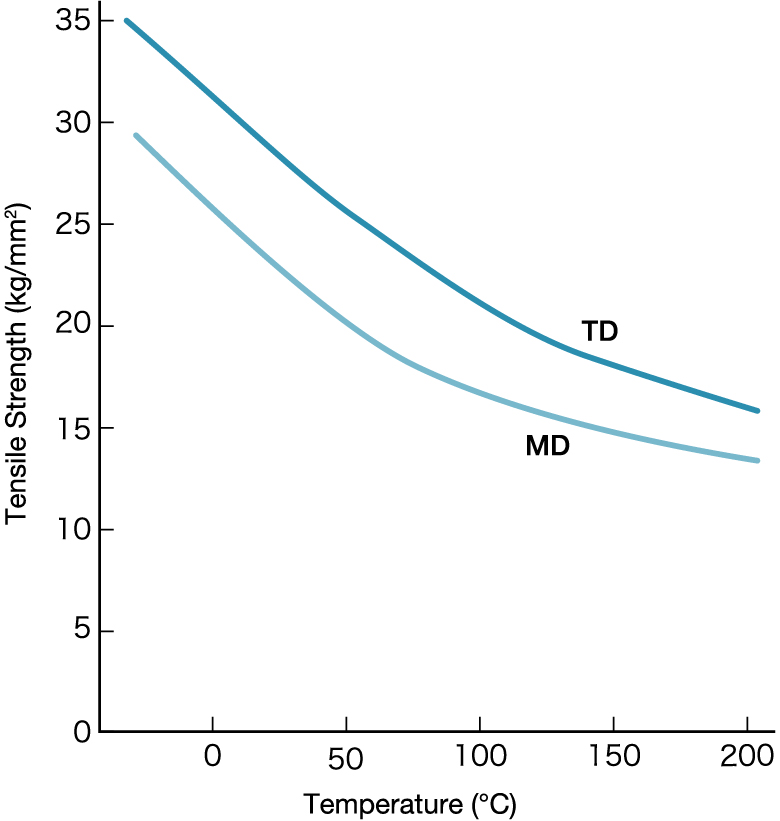 Fig. 3 shows the tensile strength and elongation curve for #38 (38 μ) Lumirror™ measured between the temperatures of -20 and +200°C.
